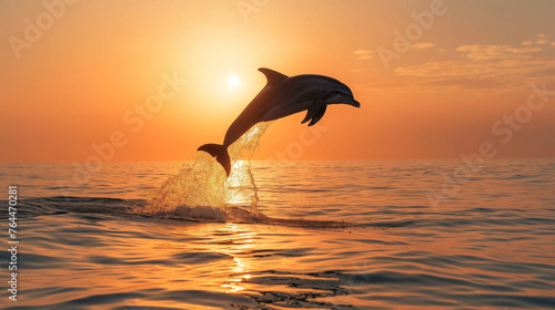 Dolphin Leaping Out of Water with Sunset Background. Generative AI.