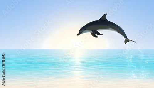Dolphin leaping over ocean at sunrise; peaceful seascape for travel brochures