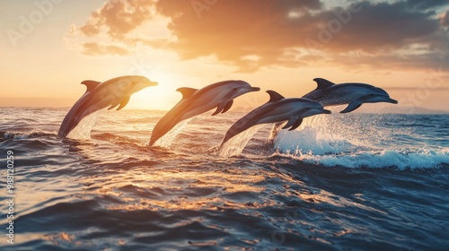 Dolphins leaping over ocean waves during sunset, showcasing nature's beauty and grace.