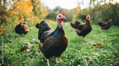 domestic turkey walking in a farm meadow