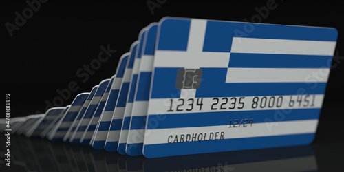 Domino effect, falling credit cards with flag of Greece, fictional data on card mockups. Financial crisis related 3d rendering