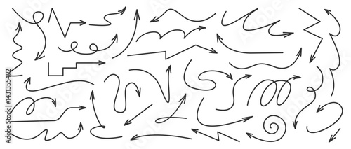 Doodle black arrows. Scribble direction pointers symbols. Collection of various simple linear arrows. Mark up down left right twisted. Hand drawn spiral, twist, curve, wave, swirl lines, arrows. Vecto