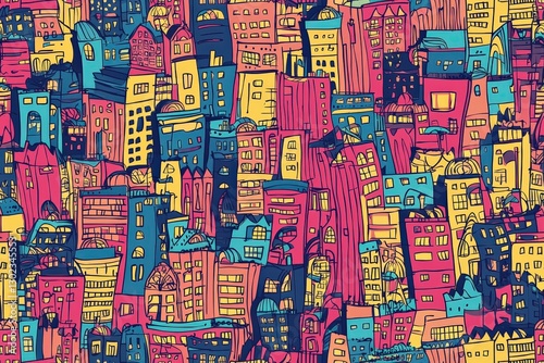 Doodle of imaginary cartoon city seamless pattern texture