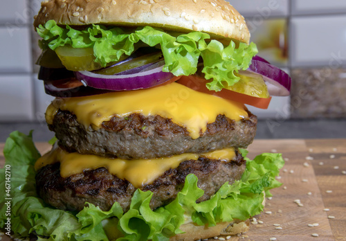 Double burgers with lettuce, tomatoes and cream cheese on wooden board