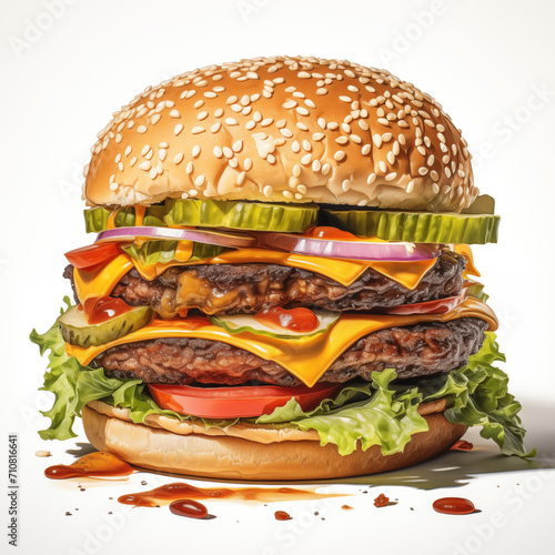 Double decker burger with all the classic fixings, including lettuce, tomato, cheese, and condiments. Tasty burger isolted on white background. Banner, ptomotion, menu