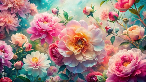 Double Exposure Floral Background: Hibiscus, Roses & Peonies