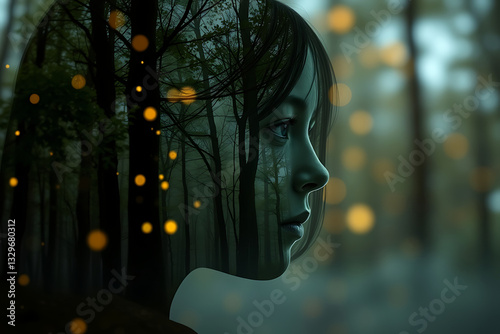 Double exposure of a girl’s gentle expression dissolving into a tranquil forest, with soft, glowing moonlight filtering through trees. AI-generated