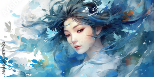 Double exposure portrait of young asian woman with a plants and leaves. Colorful creative watercolor illustration