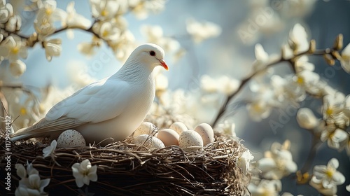 Dove and Easter eggs on spring background