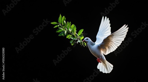 Dove flying gracefully with an olive branch against a dark background.