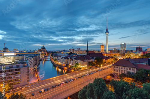 Downtown Berlin with the famous Television Tower and the Spree river at night
