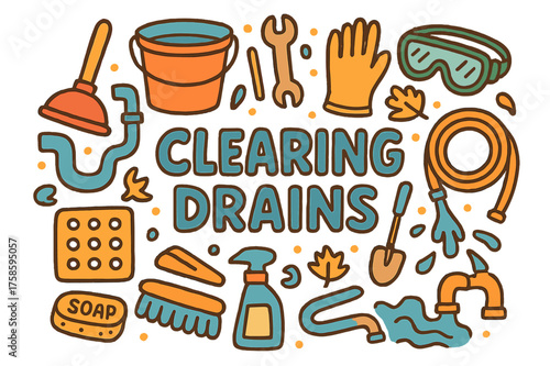 Drain Clearing Doodle. Clearing Drains. Hand-drawn doodle illustration of Clearing Drains. plunger, pipe,