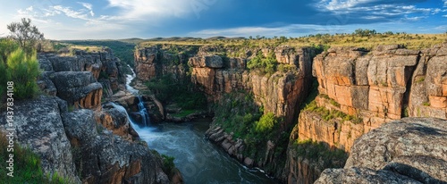 Dramatic canyon landscape with cascading waterfall.