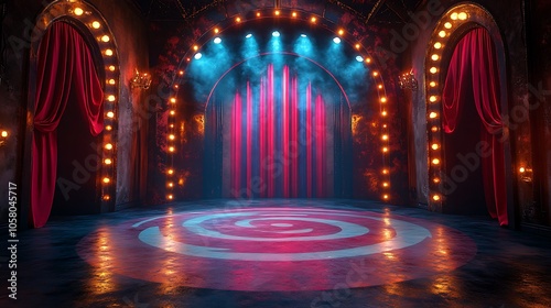 Dramatic circular stage design with vintage circus arches and warm lights illustration