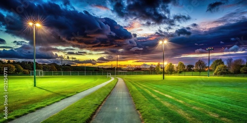 Dramatic cloudscape, floodlights illuminating Gaelic athletes; goalposts frame the action-packed night.