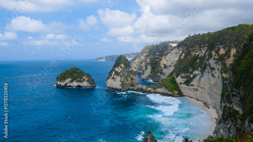 Dramatic coastal cliffs and unique rock formations meet the turquoise ocean in Nusa Penida, Bali. A breathtaking tropical island landscape.