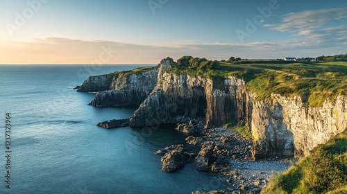 Dramatic coastal cliffs meet the vast ocean under a serene evening sky at dusk