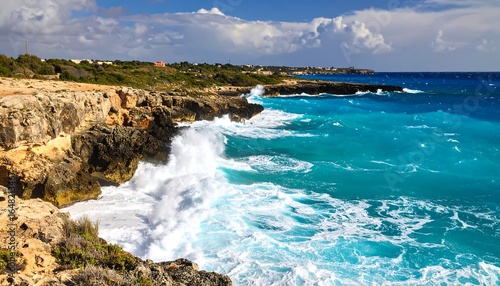 Dramatic coastal scene with turquoise waves crashing on rocky shore