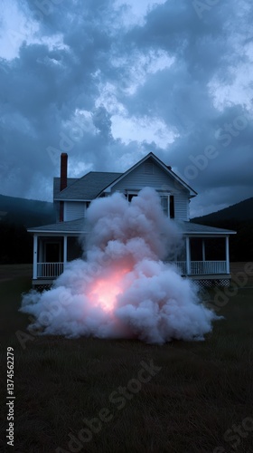 Dramatic Fire Erupts Beneath Old House in Evening Light with Cloud Cover