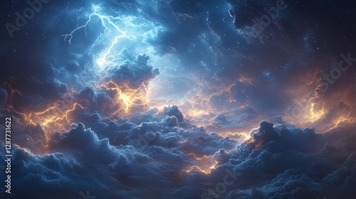 Dramatic lightning storm with fiery clouds and dark sky.