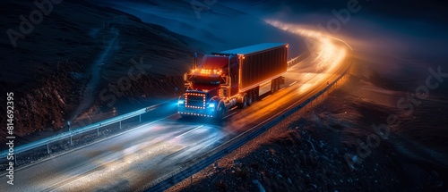 Dramatic night scene of a heavy truck climbing a steep hill, headlights and shiny guardrail lights leading the way, with copy space above