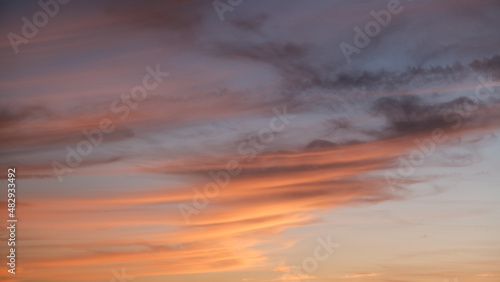Dramatic orange gray purple sky and clouds at sunset for background, colorful dramatic sky with cloud at sunset, sky texture. sunset, evening sky, background