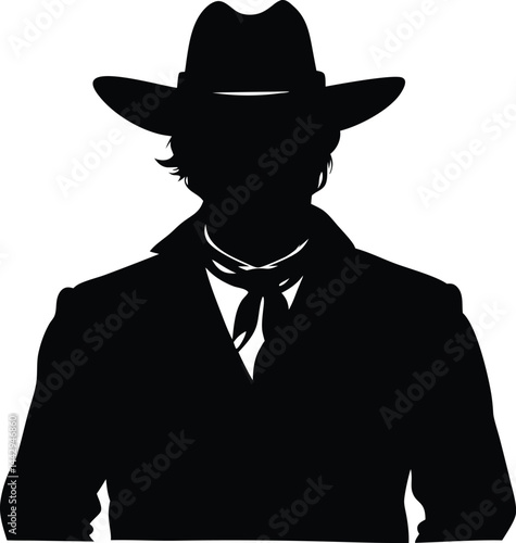 Dramatic silhouette of a classic cowboy figure in Western attire, black and white