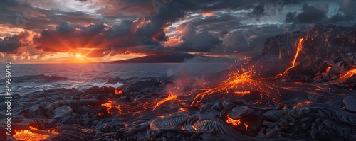 Dramatic sunset over a volcanic coastline with lava flows, 4K hyperrealistic photo