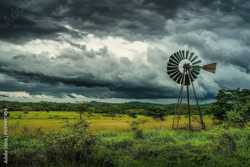 Dramatic windmill scene in lush field under stormy skies for environmental design