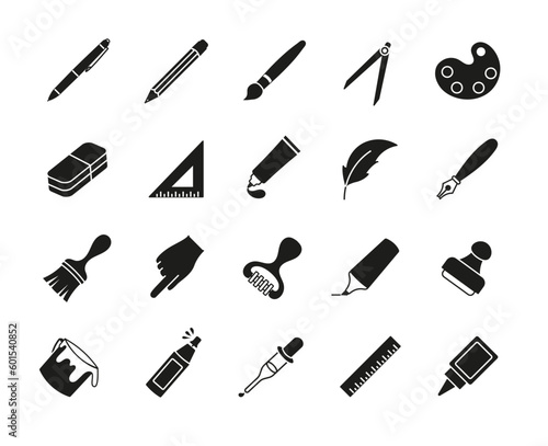 Drawing tools icons black set. Collection of graphic elements for website. Ruler and pencil, pen. Art and creativity equipment. Cartoon flat vector illustrations isolated on white background