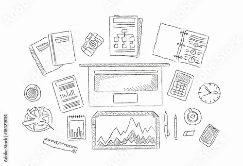 Drawn image of work table with objects