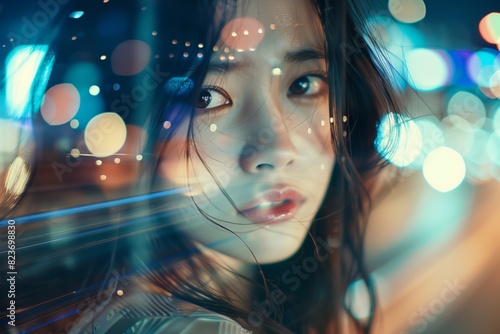 Dreamy portrait of a beautiful Asian girl with city lights. Close-up of a woman's face
