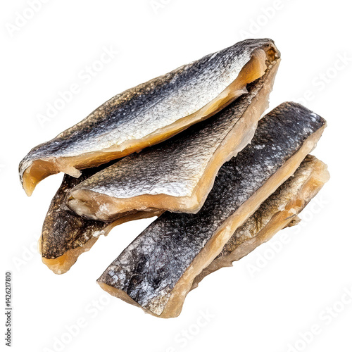 Dried fish pieces arranged on a white background showcasing their texture and color variations