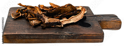 Dried mixed mushrooms including chanterelles and porcini on rustic wooden cutting board, natural organic gourmet forest fungi for cooking and culinary use