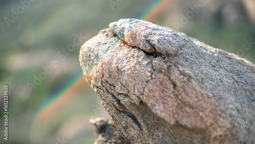 driftwood with rough texture and a vivid rainbow flare across the frame, blending natural detail with a splash of unexpected color.