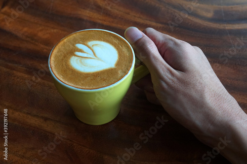 Drink scene of Hot Latt Coffee in yellow Cup on Brown wood Table at Coffee Cafe in Danang Vietnam