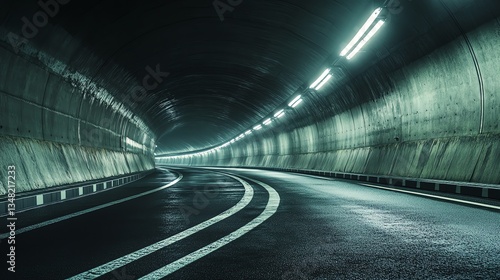Driving Through Dark Tunnel with Lights and White Lines on Asphalt