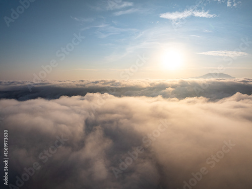 Drone aerial view of landscape fog over mountains in sunrise sky,High angle view over countryside at Southeast asia,Phang Nga Thailand,Wide angle view nature landscape