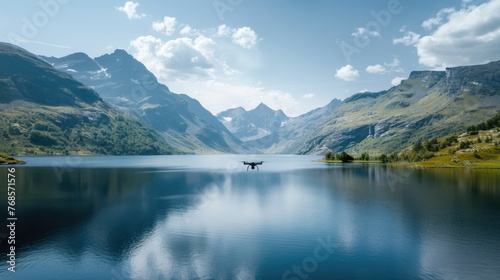 Drone flying over mountain lake during sunset.