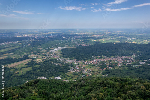 Drone panorama of the Ivrea Morainic Amphitheatre seen from Brosso, Val Chiusella, Italy, showing lush green plains, woods, and scattered villages under clear sky, high drone shot, slow motion