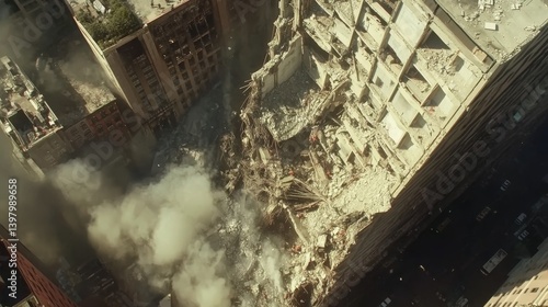 Drone View of Collapsed Commercial Tower - Rescue Operations Amidst Ruins
