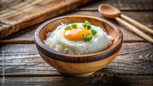 Drone View Rice Bowl Egg Breakfast Food Photography Wooden Board Closeup Asian Cuisine Overhead Shot