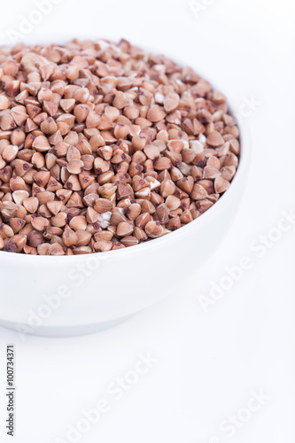 Dry buckwheat in white bowl