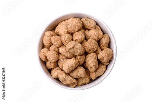 Dry soybean meat pellets, diet food for vegan and vegetarian cuisine