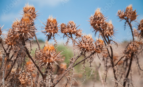Dry thorny flowers are under blue sky