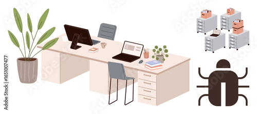 Dual desks with computers, potted plant, filing cabinets with folders, and a large bug icon. Ideal for office setup, productivity, organization, digital security, information storage workplace