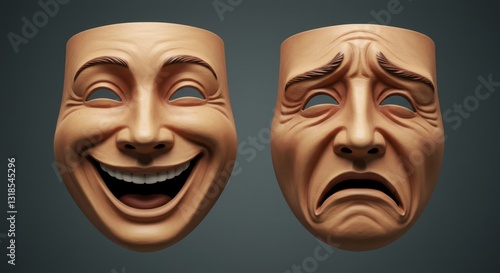 Dual expression masks showcasing joy and sorrow against a neutral background, symbolizing emotions