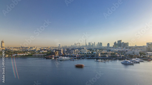 Dubai creek landscape timelapse with boats and ship and modern buildings in the background during sunset