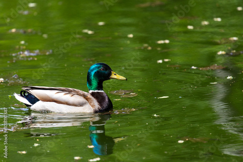 Ducks sleep, clean their feathers, eat algae. Ducks are beautifully reflected in water. A family of ducks, geese swims in a water channel, river, lake.