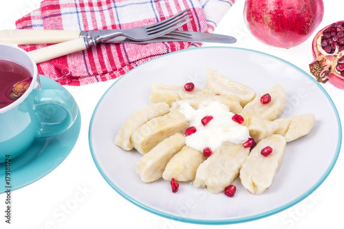 Dumplings from cottage cheese with yoghurt and pomegranate seeds